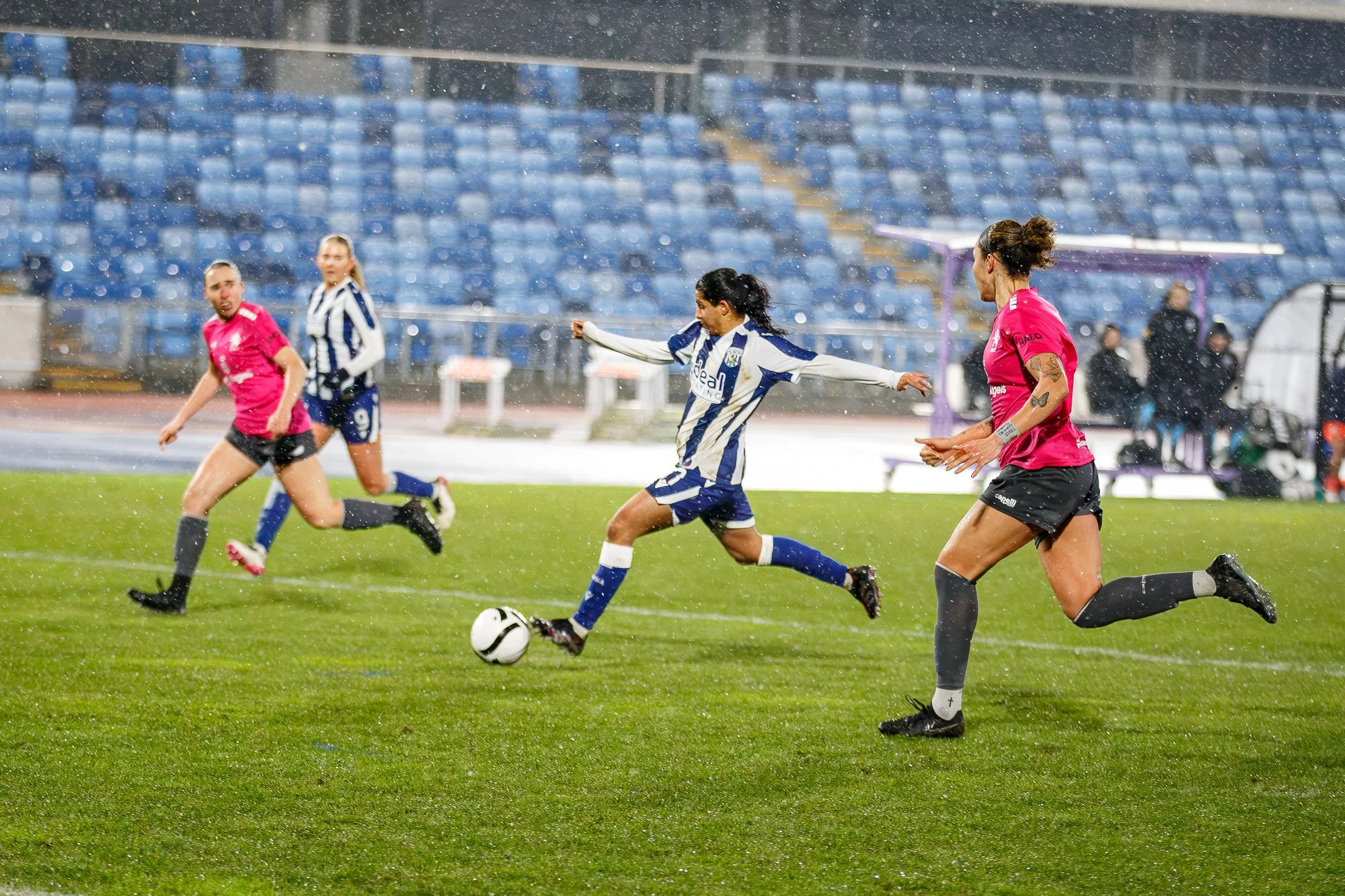 The women’s team, pictured at the top of the article, posed with the Proud Baggies flag before being put through their drills by manager Siobhan Hodgetts-Still and her coaching staff. They went on to battle through abhorrent weather conditions at the Alexander Stadium in Perry Barr to beat high-flying Rugby Borough 2-1 thanks to goals from centre-back Zoe Creaney and debutant loanee Riya Mannu (pictured below).